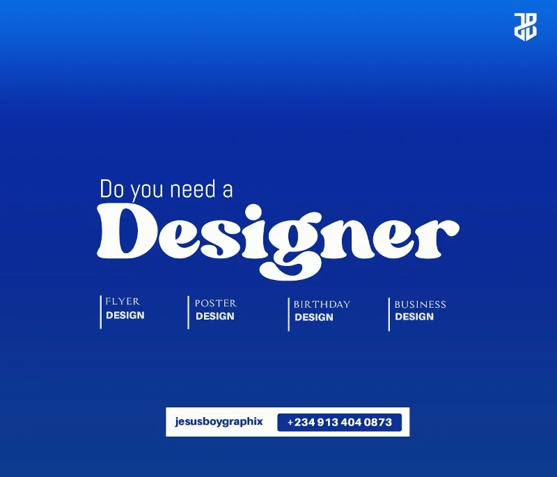 Good Day Fam❤️ I am JESUSBOY GRAPHIX. Your anointed Graphic Designer 🔥🥰 *Services* - Logo Design and Flyer Design - Print Design (Business Cards, Brochures, Flyers) - Digital Design (Social Media Graphics, Email Newsletters) - Web Design etc..... Ready to bring your vision to life? Contact us today Instagram Handle: [jesusboygraphix] WhatsApp &Call: [09134040873] Send a DM. https://wa.me/qr/UHUYFOKB3XUTG1
